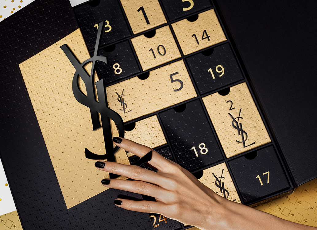 ホワイト×クラッシュゴールドのラグジュアリーなデザインに、カサンドラロゴがあしらわれたカレンダーの扉を開けると、「イヴ・サンローラン」人気製品の現品サイズ、メイクアップ、スキンケア、フレグランスなどミニサイズの合計24点がドロワーに。