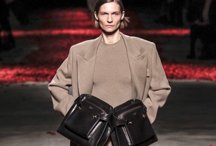 ピナ・バウシュが創設したドイツの「Tanztheater」(タンツテアター=ダンスシアター)をインスピレーション源に、ダンスのエッセンスを取り入れたフェラガモ。レオタードのようなボディスーツにバッグが2つついたようなベルトを合わせ、斬新なシルエットを提案しました。よく見ると、大人気のイットバッグ「ハグバッグ」ではありませんか! アイコンをうまくコーディネートアイテムに昇華させる技術は、売れるメゾンブランドの必須条件なのかもしれません。