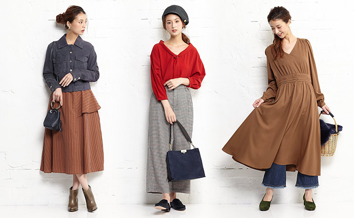 やわらかな素材感のワンピースにデニムをON。落ち着きを感じさせるコーヒーブラウンに、小粋なセミフレアシルエットが気持ちのいいレイヤード。ファーを纏ったカゴやコーデュロイパンプスで季節感をのせて。
