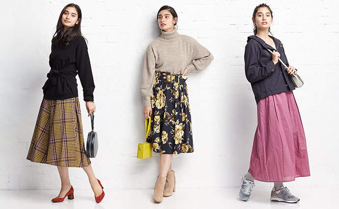 シックな黒にリボンのアクセントが大人の可愛さを引き出してくれる。1枚での即戦力に色違いで揃えたくなるニット。今年外せないキレイ色チェックのミディフレアスカートで足取りも軽やか。