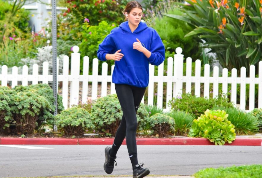 元祖スーパーモデル シンディ・クロフォードの娘。今注目の二世モデル カイア・ガーバーのランニングスタイル。このようにスウェットのフーディを取り入れるとランニング然とせず、程よく肩の力を抜いて体を動かせそうです。ビギナーの方はぜひお手本に。