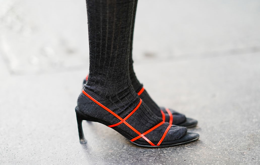 エレガントなヒールサンダルに合わせるなら、透け感がセンシュアルなシアーソックスや、ラメやグリッターが効いたシャイニーなソックスを。きれいめワンピースの着こなしも、ただ上品なだけじゃないモダンな印象に仕上がります。