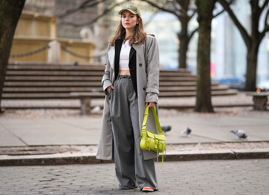 こちらは異なる色調のグレーを重ねたスタイル。グレーがかったカーキのキャップが、服とバッグの色を調和しているのも絶妙。