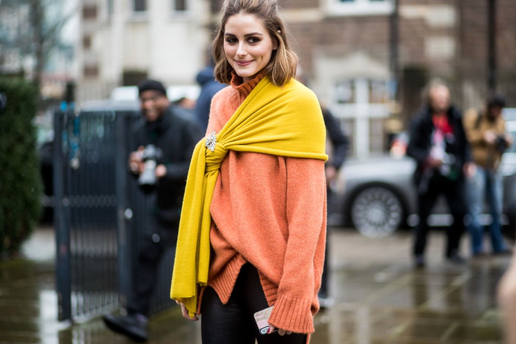 オリヴィア・パレルモは、今やシャツやニットの肩掛けテクとして定番となったスタイリング法をストールにも応用。オレンジ×イエローのカラーバランスも、レザーパンツとの甘辛コーデも、ストールの結び目やニットの袖の上から合わせたアクセサリー使いも素敵の一言。
