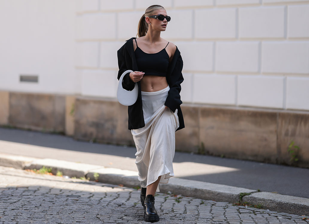 冒頭の画像は、柔らかな素材のマキシを纏うように着用したスタイル。クロップドトップや配色ですっきり見せています。