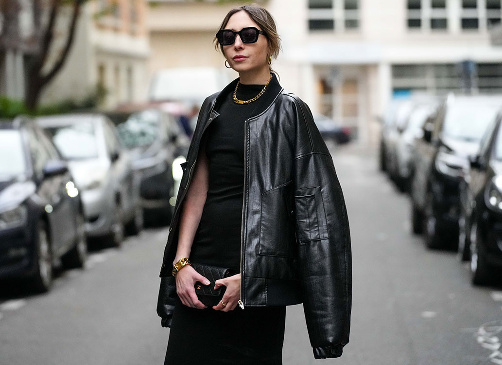 トップの画像はオーバーサイズのレザーブルゾンを羽織った女性。クラッチもレザー。革の艶感がワントーンコーデにメリハリをつけています。