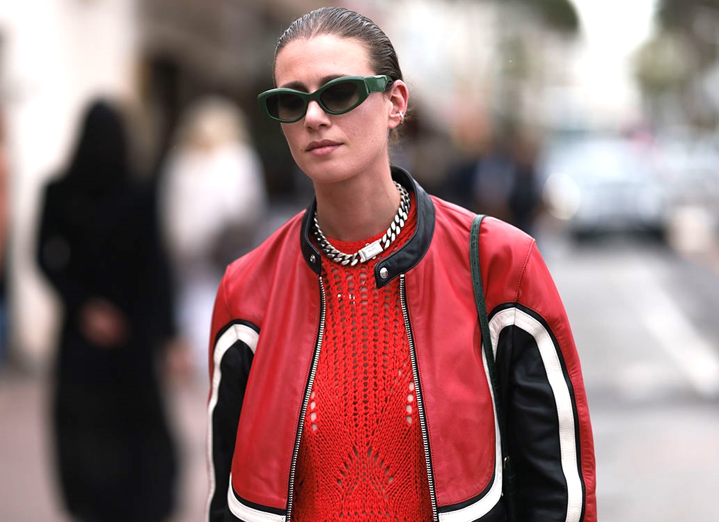 このコーデと似たアイテムを探す>>> ライダースジャケット / レッドのワンピース / バレエシューズ / ネックレス