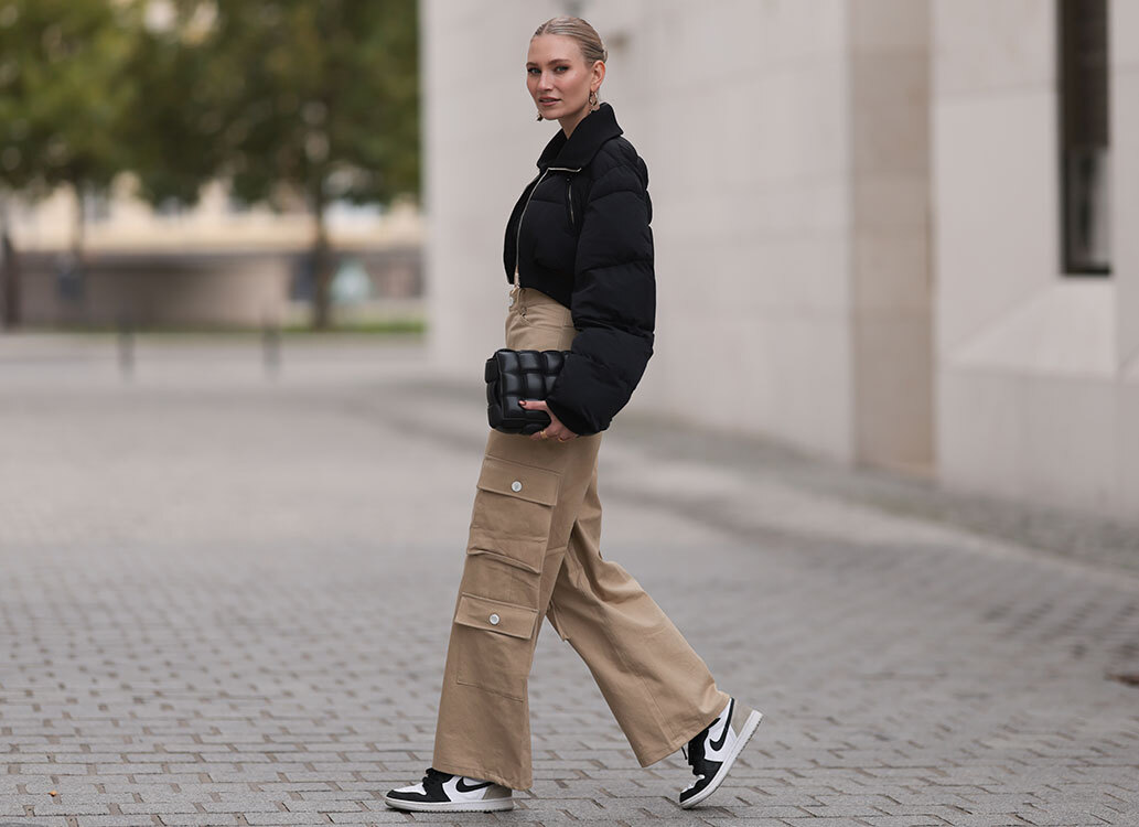 このコーデと似たアイテムを探す>>>ショート丈パファーブルゾンワイドパンツスニーカー