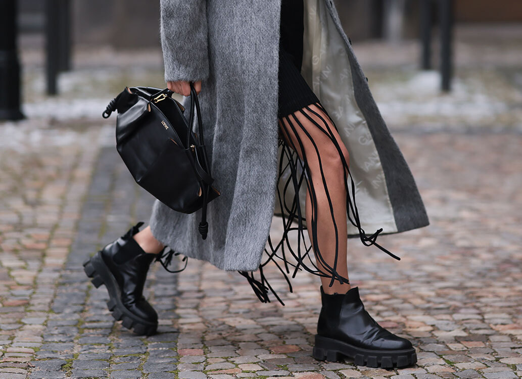 こちらは、「PRADA」のサイドゴアブーツを取り入れたスタイル。海外のストリートで光るおしゃれさんの足元は、“厚底”がスタンダード。黒とグレーの地味色コーデながら、旬のY2Kファッションの象徴とも言える厚底を取り入れれば、グッと新鮮な雰囲気に。