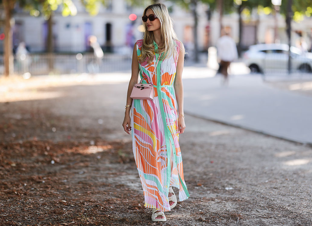 プッチ柄の魅力を最大限楽しむならドレス! こちらはシルク100%、明るい色柄が美しいロングドレス。大胆なVネックは工夫次第で見せ方いろいろ。