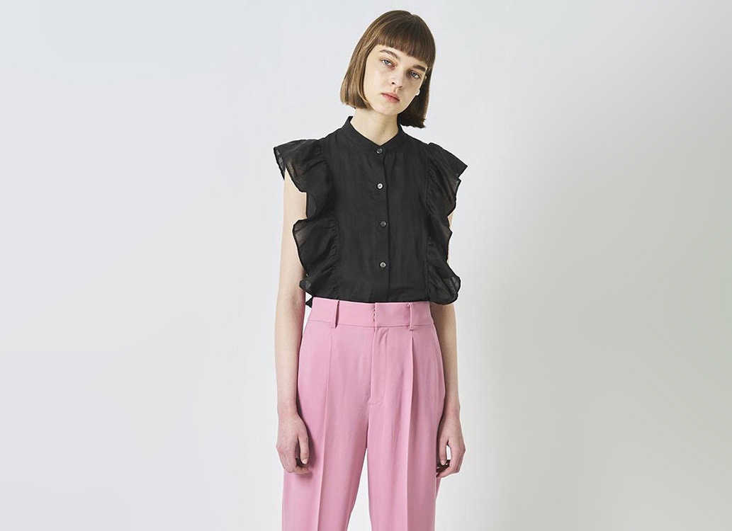 肩から脇へと流れるようにあしらわれた両サイドのボリュームたっぷりのフリルが、華奢な腕と上半身を演出する大人の「ノースリーブブラウス」。辛口になりがちなデニムスタイリングにフェミニンなブラウスがほどよい甘さを加えてくれます。