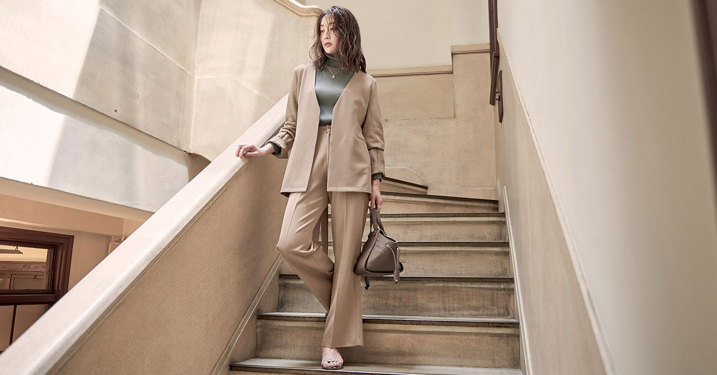 カチッとし過ぎない、程良い緩さのあるノーカラージャケットも今年は深みのあるブラウンが気分。