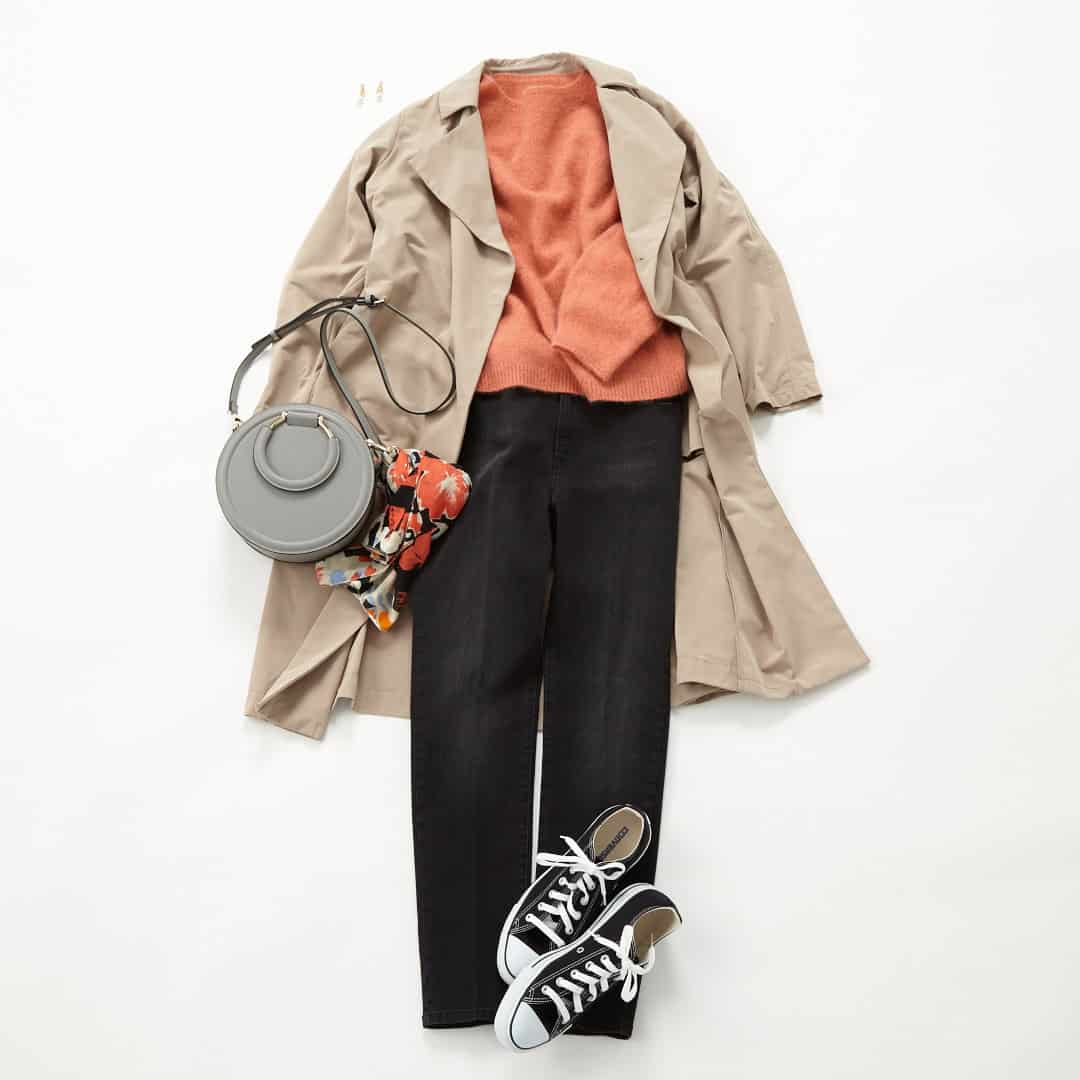 トレンドのスカーフ使いも取り入れて、アクセント付けも忘れずに。