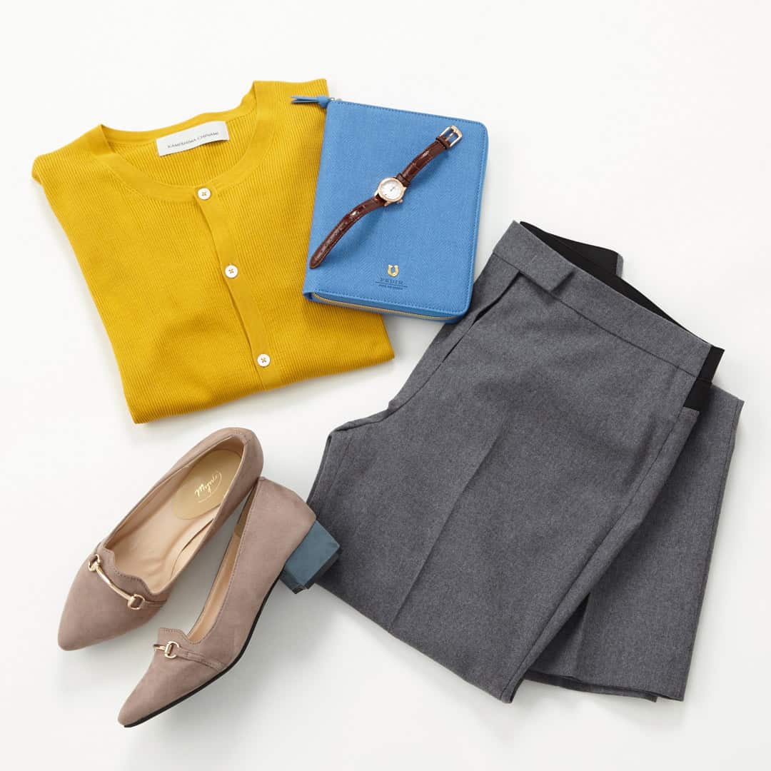 パンプスのさりげないバイカラーヒールも、かっちりしすぎないポイント作りに一役買ってくれます。
