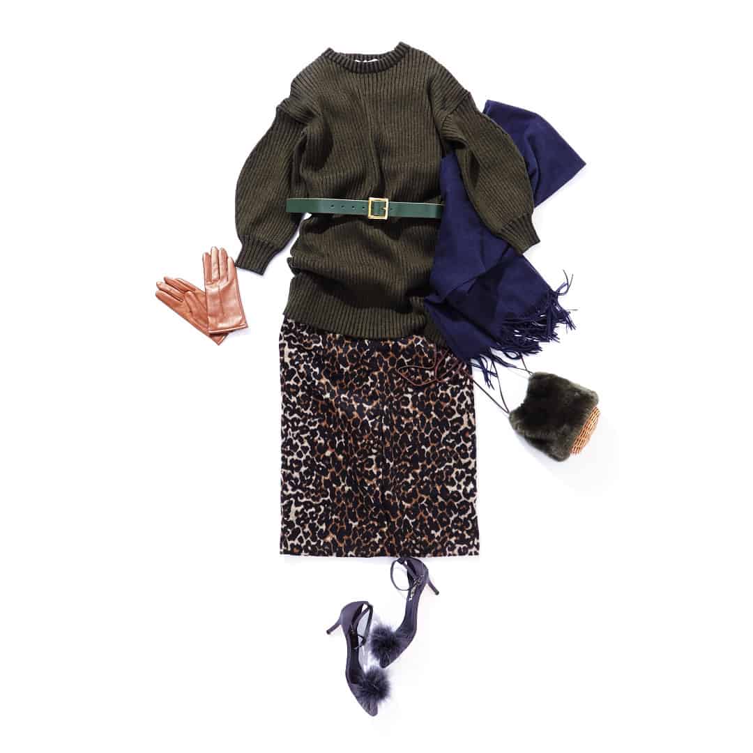 レオパードのタイトスカートがニットとカゴバッグのほっこり感を払拭してくれます。