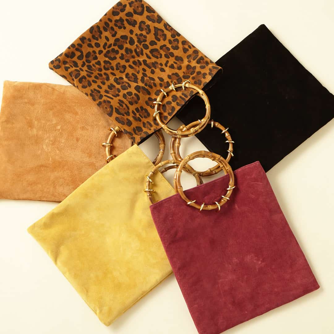 柔らかい豚革のスエードとバンブーハンドルで優しげな印象のトートバッグ。