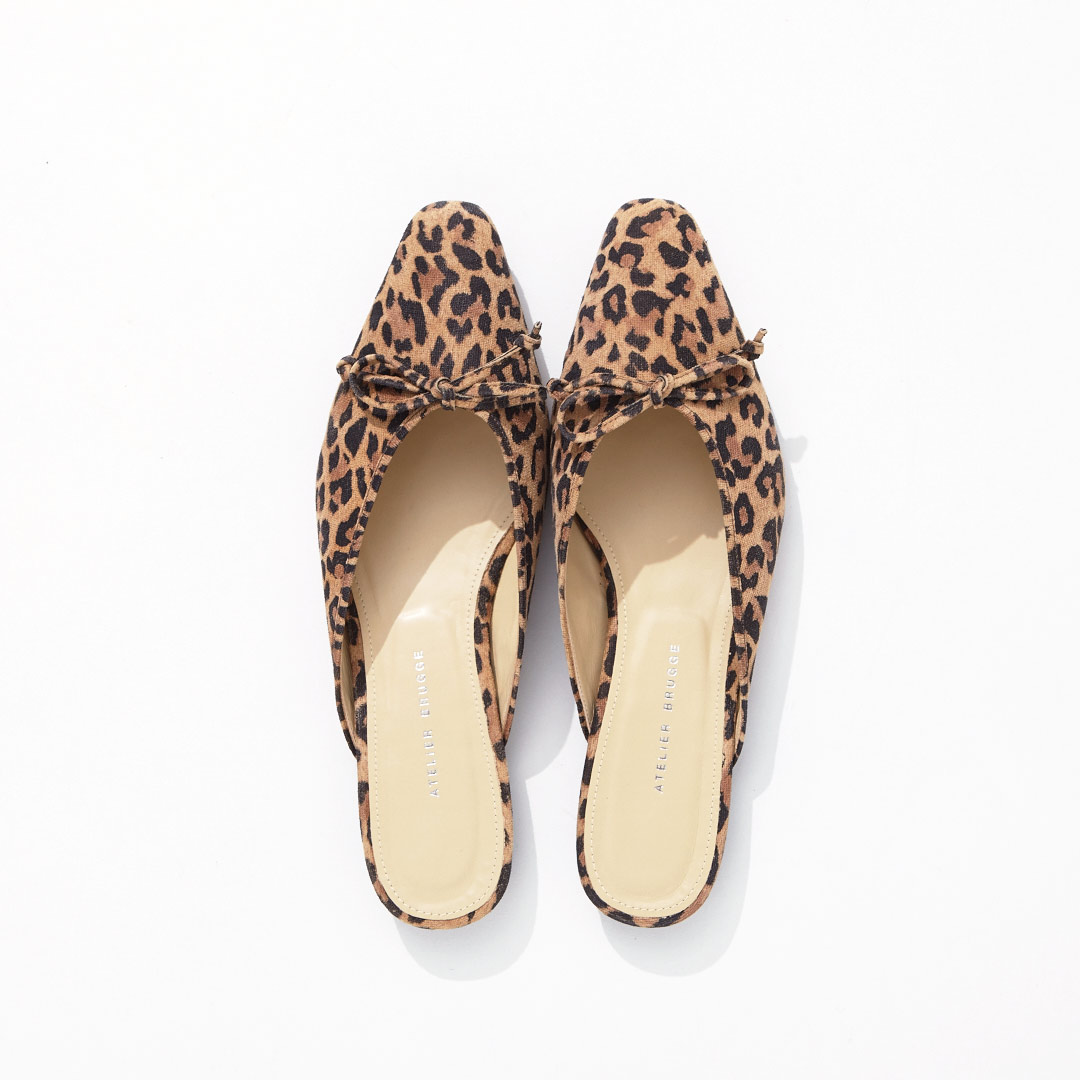 フラットミュールはレオパード・ブラック・パープルの3色展開。