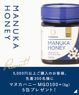 今回5,000円以上購入のお客様、先着200名様に「マヌカハニーMGO100+5g」5包をプレゼント♪