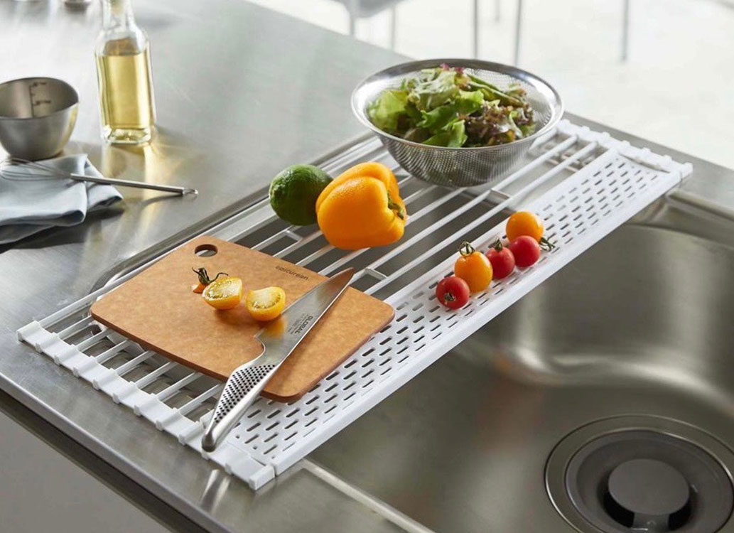 水切りシリーズの中でもイチオシ。水切りだけでなく、調理台の延長として鍋の一時置きにもなります。使わない時はくるくる丸めてコンパクトに収納でき、シンクのスペースを有効活用!仕切りが付いているので、お皿を立てて水切りできると大人気のアイテムです。