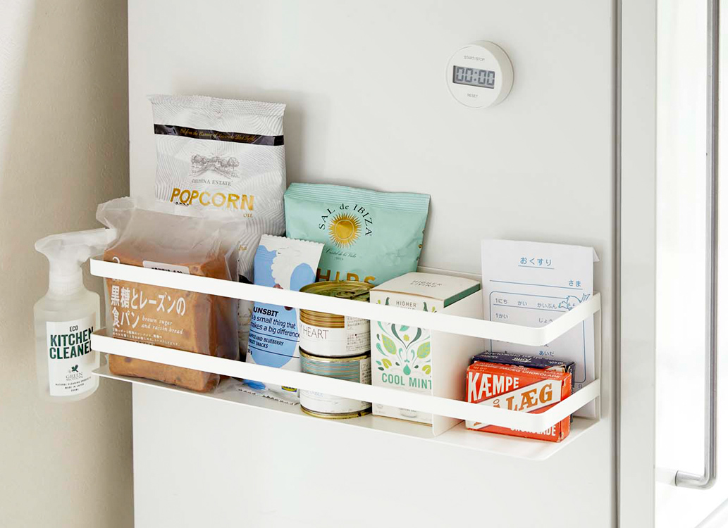 細々と集まってしまった調味料や雑貨などは、キッチンのデッドスペースになりがちな冷蔵庫横のスペースに収納。こちらはマグネットで簡単にしっかり付けられる便利ラック。定位置を決めて収納するクセをつけるだけで、散らかりにくくなり、すっきりとできます。