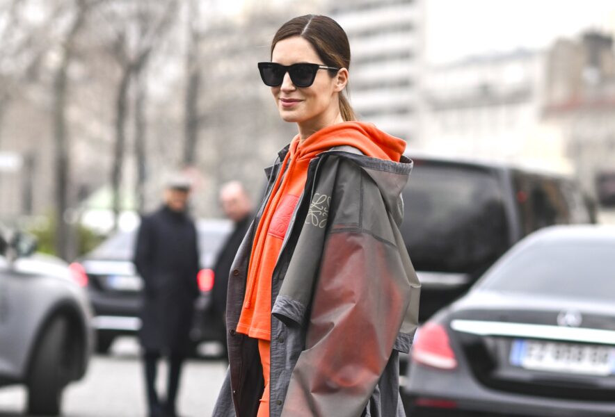 パーカー&レギンスのカジュアルなセットアップに、シアーなレインコートを合わせてモードにまとめたMIXコーデ。レインコートのフードとのダブルフードをはじめ、オレンジ×グレーの配色や、足元にレディなヒールを合わせるバランスが超上級者!