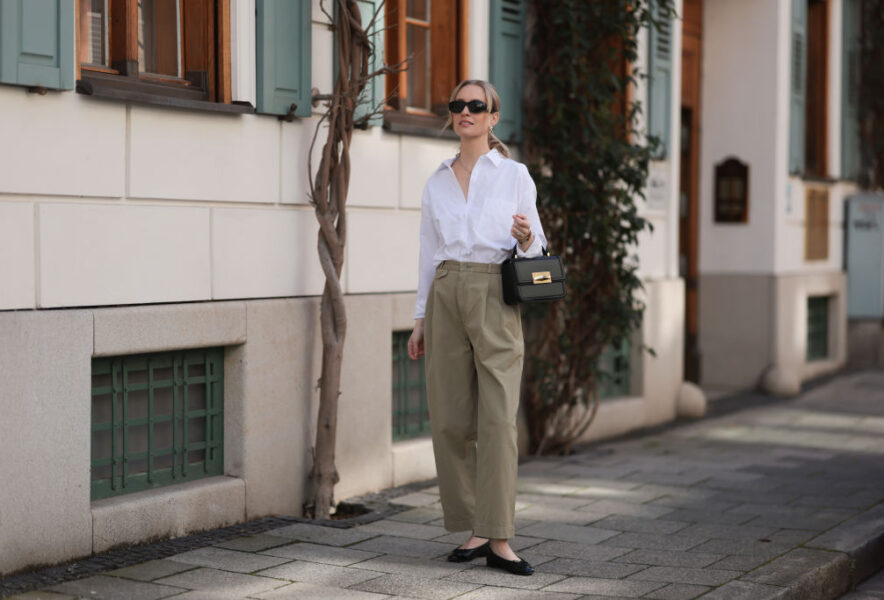 ホワイトブラウスにハイウエストの美シルエットなカーキパンツを合わせると、大人かわいらしい雰囲気にまとまります。シューズやバッグは黒系で引き締めるのがおすすめ。