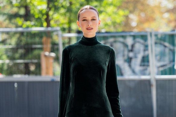 裏毛のタートルスウェットワンピースはそれだけでコーデが決まる便利アイテム。足元はスニーカー、バッグは外しでクラシカルなものを持つと今年らしい印象に。